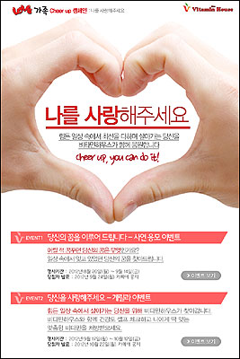 비타민하우스 7번째 ‘러브가족 Cheer up! 캠페인 - 나를 사랑해주세요 편’ 이벤트의 자세한 내용과 참여 방법은 비타민하우스 쇼핑몰 홈페이지(www.vitaminhouse.net)와 비타민하우스 공식 카페(http://cafe.naver.com/vitaminpower)에서 확인할 수 있다(문의: 02-570-6075). 국민일보 쿠키뉴스 박주호 기자 epi0212@kmib.co.kr