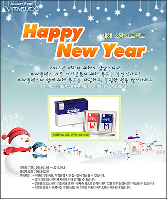 이벤트에 참여하려면 비타플렉스 홈페이지(www.vitaflex.co.kr) 이벤트란에 접속, 올해 꼭 이뤄졌으면 하는 각자의 소망을 작성해 올리면 된다. 응모자 중 추첨을 통해 5명에게 비타플렉스 포 맨, 비타플렉스 포 우먼 세트를 선물로 증정한다.