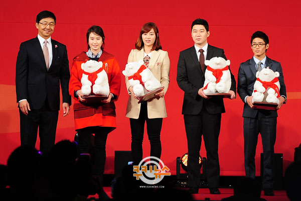 [쿠키 스포츠] 31일 오전 서울 하얏트호텔에서 열린 제 18회 코카-콜라 체육대상 시상식에서 기보배, 김지연, 진종오, 양학선(왼쪽부터)선수가 신인상을 수상했다.