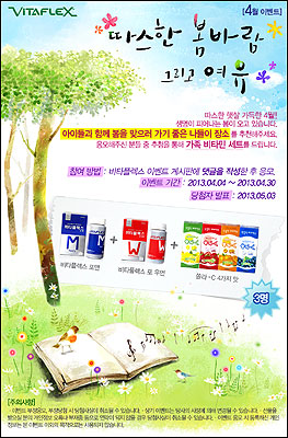 이벤트에 참여하려면 비타플렉스 홈페이지(www.vitaflex.co.kr) 이벤트란에 접속, 따뜻한 봄날 4월을 맞아 어린이와 함께 놀러 가기 좋은 추천 장소를 작성해 올리면 된다. 응모자 중 추첨을 통해 3명에게 비타플렉스(비타플렉스 포맨·비타플렉스 포우먼) 세트와 쏠라씨 4가지 맛(레몬·딸기·오렌지·포도)을 선물로 증정한다.