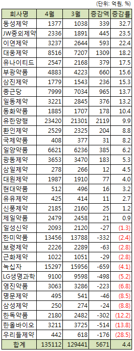 이밖에도 부광약품, 삼진제약, 종근당, 일동제약, 동화약품 등이 10%이상 증가율을 보였다.