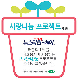 삼진제약의 대표적인 사회공헌활동으로 자리 잡은 사랑나눔 프로젝트는 2011년부터 시작돼 올해로 3회째를 맞는다. 올해는 고지혈증 치료제 뉴스타틴-에이 매출액의 일정액(1%)을 적립, 임직원 모두가 기부와 사회봉사에 나설 예정이다.