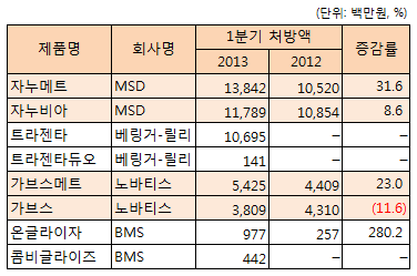 반면 단일제인 ‘가브스’는 DPP-4계열 신제품 출시 등의 영향을 받으며 1분기 처방액이 38억원에 그쳤다.