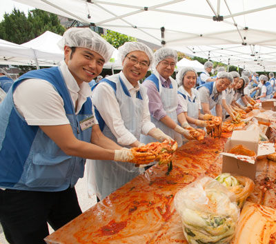 이날 녹십자 신입사원들과 조순태 사장(왼쪽 두 번째)을 비롯한 회사 임직원 100여 명은 배추김치, 깍두기, 열무김치 등을 사랑과 정성으로 담궜다.