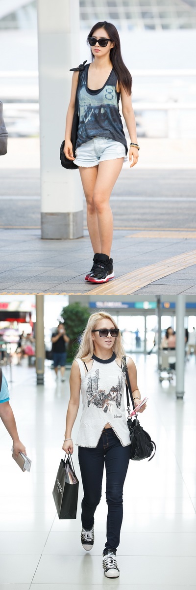 지난달 30일 소녀시대의 유리와 효연은 ‘댄싱 9’의 해외 평가전을 위해 LA로 출국했다. 효연은 멋진 선글라스와 민소매 셔츠에 편안한 스키니 진을 매치, 털털하면서도 어디서든 춤을 출 수 있을 것 같은 멋진 스트릿 패션을 선보였다. 또한 유리는 더운 날씨에 보는 사람까지 시원해지는 민소매 저지 셔츠와 핫 팬츠를 조합해 매력적인 각선미를 과시했다.