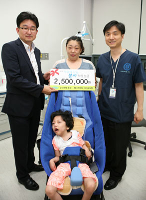 삼진제약은 최근 장애가정 청소년을 지원하는 한국장애인재활협회 두드림을 통해 뇌병변 1급 최석훈 어린이(남. 8)에게 치과수술과 보조기기 지원금을 전달했다.