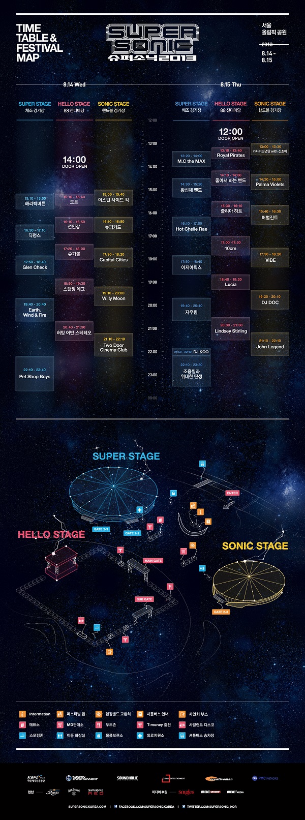 [쿠키 연예] 도심형 뮤직 페스티벌 ‘슈퍼소닉 2013’이 공식 홈페이지를 통해 타임 테이블과 페스티벌 맵을 공개했다.