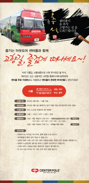센터폴이 마련한 추석 귀성·귀경 버스 이벤트는 부산, 대구, 대전, 광주 지역행 45인승 버스 총 4대로 왕복 운행된다. 9월 18일 오전 8시 서울 잠실종합운동장 입구에서 출발해 부산 아리랑호텔 앞, 동대구역 앞, 대전역 후문, 광주 시외버스 터미널 뒤편에서 각각 하차하며, 21일 오후 2시 각 지역 하차 지점에서 서울로 다시 출발한다.