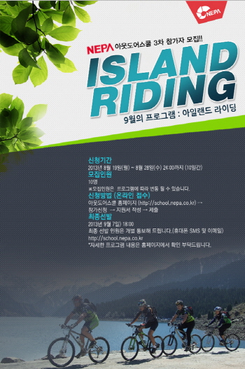 참가 신청은 오는 28일까지 아웃도어 스쿨 홈페이지(school.nepa.co.kr)를 통해 평소 자전거 라이딩을 즐기는 누구나 신청 가능하며, 모집 인원은 총 10명이다. 선발된 인원에게는 아웃도어 활동에 필요한 장비와 숙식 일체가 지원되며 참가비는 무료다.