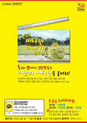 경남제약은 2013년 레모나 발매 30주년을 맞아 고객 감사의 일환으로 총 상금 1000만원 규모의 전국민 비타민 이야기 공모전을 개최한다. 이번 공모전은 3만명이 넘는 지원자가 몰리며 큰 화제를 낳았던 지난 5월의 레모나 광고모델 공개 오디션에 이어 두 번째로 이뤄지는 고객 감사기념 국민 참여형 이벤트로 레모나를 사랑하는 고객이라면 누구나 참여 가능하다.