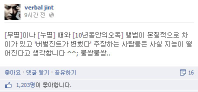 버벌진트는 11일 오전 자신의 SNS 계정에 “‘무명’이나 ‘누명’ 때와 ‘10년동안의 오독’ 앨범이 본질적으로 차이가 있고 ‘버벌진트가 변했다’ 주장하는 사람들은 사실 지능이 떨어진다고 생각합니다 ^^; 불쌍불쌍”이라는 글을 올렸다. 이는 버벌진트의 2007년도 출시 앨범인 ‘무명’과 2008년도 출시 앨범인 ‘누명’에 비해 2012년 출시된 ‘10년 동안의 오독’ 앨범이 가지고 있는 간극을 비판적으로 논한 사람들에게 일종의 불만을 토로한 것으로 보인다.