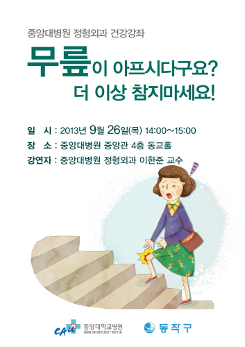 [쿠키 건강] 중앙대학교병원은 오는 26일(목) 오후 2시부터 중앙관 4층 동교홀에서 ‘무릎관절 퇴행성관절염의 올바른 이해’라는 주제로 건강강좌를 개최한다.