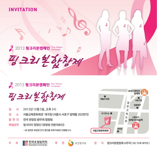 [쿠키 건강] 한국유방암학회는 오는 10월 5일 오후 2시 서울교육문화회관 대극장에서 ‘2013 핑크리본 합창제’를 개최한다.