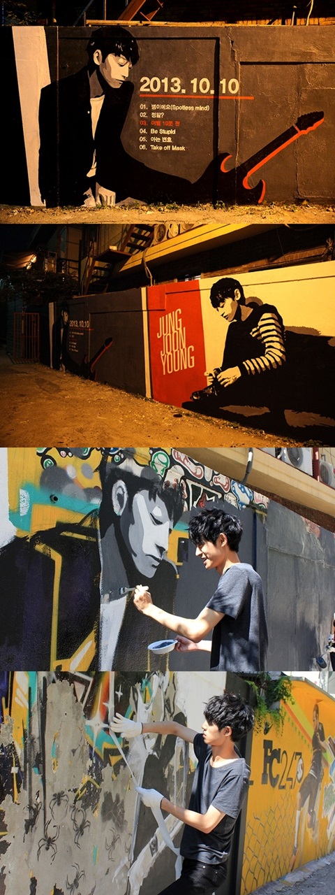 오는 10일 공개되는 정준영의 앨범 트랙리스트가 홍대 앞 거리에 벽화로 그려져 있어 눈길을 끈다. 벽화를 통해 공개 된 정준영의 미니 앨범에는 선공개 곡 ‘병이에요’(Spotless Mind)를 포함해 ‘정말?’, ‘이별 10분 전’, ‘Be stupid’, ‘아는 번호’, ‘Take off Mask’로 총 6 곡이 수록됐다. 이 중 ‘이별 10분 전’이 타이틀곡임을 암시하듯 붉은 색으로 명시돼 있다.