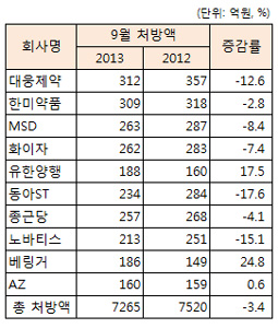 9월 총 처방액 3.4% 감소… 동아제약-노바티스 부진