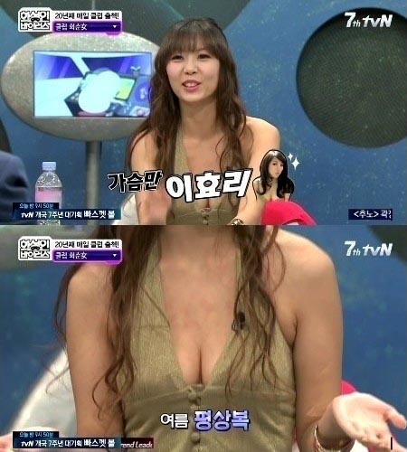 이씨는 그러나 “더운데 옷을 벗어도 되겠느냐”며 겉옷을 벗어 가슴과 배꼽을 노출해 MC들을 놀라게 했다. 이경규와 김구라는 “이런 행동이 바로 남자를 유혹하는 것”이라며 손사래를 쳤다.