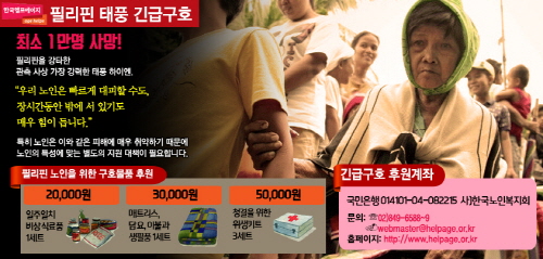 한국헬프에이지는 12일부터 긴급구호 모금 계좌를 개설하고, 온라인 모금을 통해이번 태풍으로 피해를 입은 필리핀 노인들의 절실한 상황을 알리고 있다.