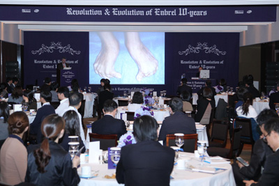 각 발표에서는 엔브렐이 장기적으로 축적해온 주요 임상 연구 결과를 통해 엔브렐의 효과와 안전성 프로파일, 류마티스관절염 치료에서 생물학적제제가 가지는 의미를 짚어보는 시간을 가졌다. 엔브렐은 시판 이후 12년 이상 다양한 임상연구를 통해 류마티스 질환 환자들의 관절 손상 진행 여부 판단에 중요한 기준인 방사선학적 진행의 지연 및 MTX(methotrexate) 단독투여에 비해 높은 기능적 관해 도달률을 입증했다. 또한 10년 이상 장기간의 지속적인 효과와 우수한 내약성을 확인했으며, 용량 증량 가능성이 낮음을 입증했다.