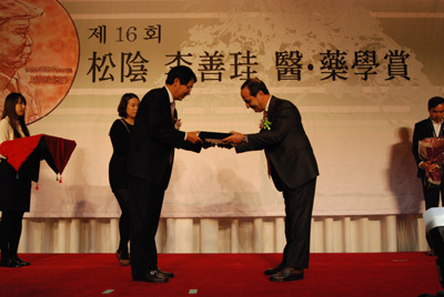 [쿠키 건강] 동성제약은 지난 25일 서울 강남구 역삼동 르네상스 서울호텔 3층(다이아몬드 볼륨)에서 제16회 송음 의약학상 시상식을 가졌다. 수상자에는 이지우 서울대학교 교수와 이탈리아의 니콜라 트라비에소 박사가 선정됐다.