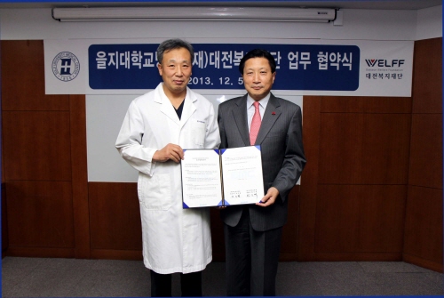 [쿠키 건강] 을지대학교병원과 대전복지재단은 5일 오후 2시 을지대학교병원 5층 회의실에서 을지대학교병원 황인택과 대전복지재단 정진철 대표이사를 비롯한 양 기관 관계자 10여명이 참석한 가운데 업무협약을 체결했다.