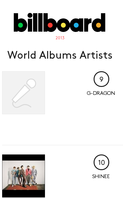 13일(현지시간) 빌보드는 올해의 2013년 결산차트(2013 YEAR END CHART)를 발표했다. 그 중 미국 아티스트를 제외한 월드 앨범 아티스트 연간 차트에 지드래곤과 샤이니는 각각 9위와 10위에 등극하며 해외 아티스트 사이에서 이름을 빛냈다. 한국 가수가 빌보드 연말 결산 앨범 차트에 이름을 올린 것은 K팝 단독 차트를 제외하면 이번이 처음.