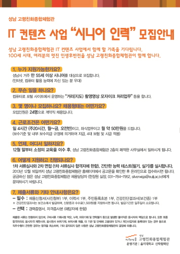 IT 콘텐츠 사업은 성남시 거주 만 55세 이상 시니어들에게 포털사이트 지도서비스에서 제공하는 사진의 행인이나 자동차 번호판 등 개인정보 누출을 막기 위한 모자이크 처리 등의 업무를 맡긴다.