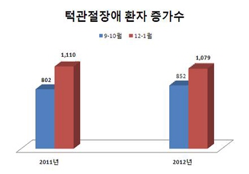 2011년 가을에 해당하는 9~10월 턱관절장애로 내원한 환자수가 802명에서 12~1월에 1110명으로 38% 증가했으며, 2012년의 경우 같은 시기에 852명에서 1079명으로 27% 증가해 겨울철 환자 수가 평균 33% 증가한 것으로 나타났다.