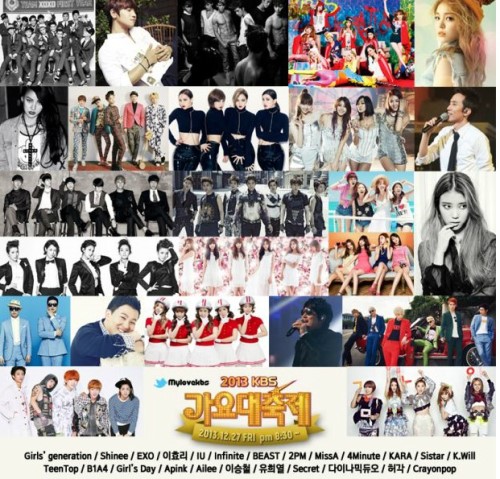 KBS는 26일 공식 SNS계정을 통해 “올 한해 가요계를 빛낸 K-POP 가수 총출동!!”이라는 글과 함께 사진 한 장을 게재했다. 올해 가요계를 결산하는 가요대축제에 참여하는 가수들은 이효리, 유희열, 이승철, 소녀시대, 엑소(EXO), 샤이니, 아이유, 인피니트, 비스트, 2PM, 미쓰에이, 포미닛, 카라, 씨스타, 케이윌, B1A4, 걸스데이, 에이핑크, 에일리, 씨크릿, 다이나믹 듀오, 허각 등이다.