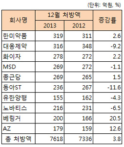 유비스트 자료를 통해 12월 처방실적을 분석한 결과, 총 처방액은 7618억원으로 전년 7336억원 대비 3.8% 증가한 것으로 나타났다.