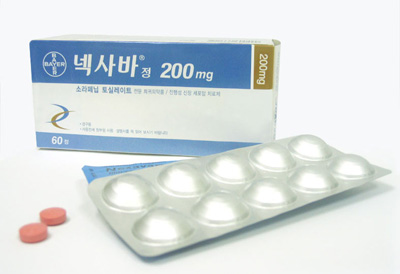 넥사바는 현재 전세계 100여 개국에서 간세포성암 및 진행성 신장세포암 치료제로 승인 받았으며, 미국에서는 FDA 우선심사 대상으로 지정돼 2013년 11월 방사성 요오드 치료에 반응하지 않는 국소 재발성 또는 전이성의 진행성 분화 갑상선암 치료제로 승인 받았다.