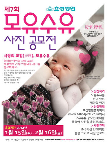 이번 사진 공모전은 대구 효성병원이 7년 째 진행하는 행사로 모유수유를 하고 있는 엄마를 대상으로 실시되며, 출품작은 모유수유 자세가 담긴 사진이거나 모유수유 장점이 잘 알리는 체험수기면 된다.