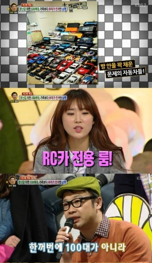 권재관은 “이건 고민이 아니라 자랑거리다”라며 “어릴 때부터 사다 보니 100대가 됐다. 심신을 달래주는 취미이며, 굉장히 좋다”고 자신의 장난감 차를 선보이기도 했다.