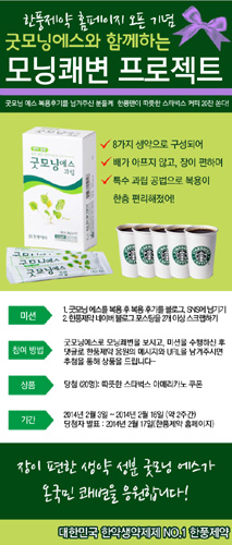 한풍제약의 이번 이벤트는 ‘굿모닝-에스’ 복용 후기를 자신의 SNS에 올리는 미션과 한풍제약 블로그의 변비 직빵 카테고리에 있는 굿모닝-에스 관련 포스팅 중 2개를 자신의 블로그나 카페, 기타 SNS에 스크랩하는 미션을 수행하고 댓글로 한풍제약 응원 메시지와 스크랩해간 URL을 남기면 추첨을 통해 상품을 받을 수 있다.
