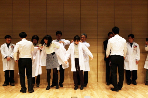 ‘화이트코트 세레머니’ 행사는 ▲개회 ▲국민의례 ▲축사(김효명 의과대학장) ▲격려사(김우경 의무부총장) ▲축가(의대 합창단) ▲White Coat 착복식 ▲학생선서(학생대표) ▲교가제창 ▲폐회 순으로 진행됐으며, 특히 착복식에서는 의대 교수들이 직접 학생들에게 흰 가운을 입혀주며 예비의사로서 첫 발을 내디딘 학생들을 격려했다.