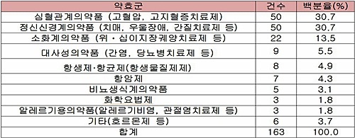 치료영역별 승인건수는 심혈관계의약품 50건(30.7%), 정신신경계의약품 50건(30.7%), 소화계의약품 22건(13.5%) 등의 순서로 많았다. 고지혈증 및 고혈압치료제 등 심혈관계의약품의 경우 지난해 50건(30.7%)이 승인되어 ‘2012년(82건)에 비해 39% 줄어들었다.