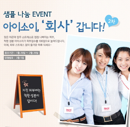 아이소이는 잦은 야근과 과중한 업무스트레스로 점점 나빠지는 피부가 고민인 직장인들의 피부 스트레스를 해결해주기 위해 이번 ‘샘플 나눔 이벤트’를 마련했다.