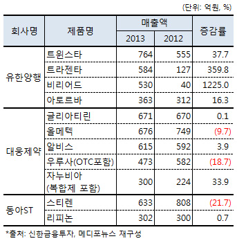 전문의약품 비중이 높은 상위 3개사(유한양행, 대웅제약, 동아ST)의 매출 상위제품을 분석한 결과, 300억원대 이상을 기록한 제품은 총 11개 였다.