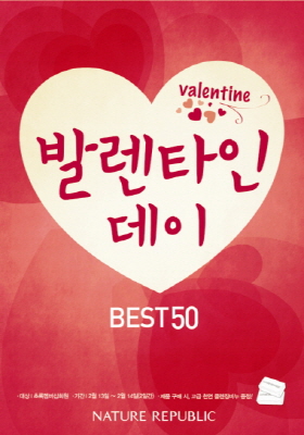 네이처리퍼블릭은 밸런타인데이를 맞아 13일부터 2일간 온-오프라인에서 초록 멤버십 회원을 대상으로 남성용 제품 등을 최대 50% 할인하는 ‘밸런타인데이 베스트50 기획전’을 실시한다고 밝혔다.
