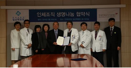 한국인체조직기증재단은 2월 18일 일산백병원에서 유명철 재단 이사장, 서진수 일산백병원장 등 양 기관 관계자들이 참석한 가운데 ‘인체조직 생명나눔 협약식’을 체결했다고 밝혔다.