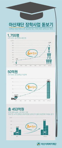 [쿠키 건강] 아산사회복지재단은 불우계층에게 교육의 기회를 주고, 우수한 인재를 육성하고자 1977년 재단 설립 이후부터 꾸준히 장학사업을 키워왔다. 지금까지 2만 6천여 명의 학생들이 453억 원의 장학금을 지원받아 꿈을 키워나갔다.