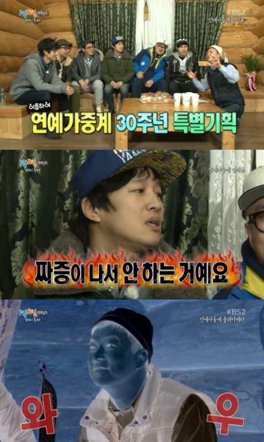 김생민이 ‘연예가중계’ 인터뷰를 진행하자 차태현은 짜증을 냈으며, 멤버들은 다투었다. 김종민은 데프콘의 콜레스테롤 수치를 언급하며 김생민을 당황시켰고, 나아가 김주혁의 많은 나이를 비꼬며 싸움을 걸었다. 이에 김주혁은 명품 배우다운 화내는 연기를 펼쳤다.