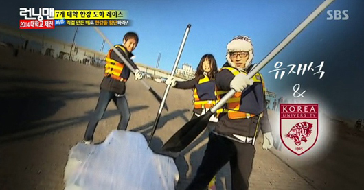 2일 방송된 SBS ‘일요일이 좋다-런닝맨’에서는 개강을 맞은 7개 대학 한강 도하 레이스가 전파를 탔다. 송지효와 건국대학교 팀이 1위, 개리와 성신여자대학교 팀이 2위, 유재석과 고려대학교 팀이 3위를 차지했다. 문제는 방송 초반에 벌어졌다. 이날 고려대학교와 유재석 팀을 소개하는 장면에서 등장한 고려대학교 마크는 바로 극우파 커뮤니티 사이트 ‘일간베스트 저장소’ 의 사용자가 ‘일베’ 유저를 뜻하는 자음 ㅇ과 ㅂ을 호랑이 귀에 합성해놓은 2차 창작 마크였던 것.