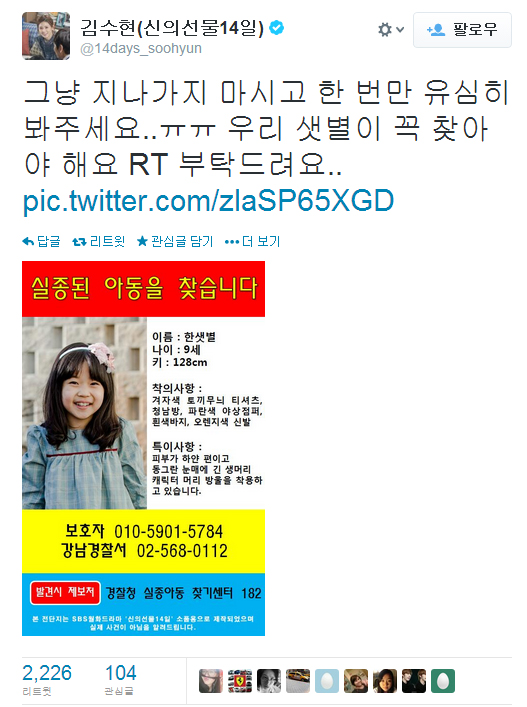 “샛별이를 찾아주세요”. 4일 오후 SNS상에 게재된 전단이다. 얼핏 실종 아동 찾기 전단지를 표방하고 있지만 이는 사실 SBS 월화극 ‘신의 선물-14일’의 이색 마케팅이다. 바로 극 중 아이가 유괴·살해당해 범인 찾기에 나선 주인공 ‘김수현’(이보영)의 SNS계정을 개설한 것. 해당 계정은 극 중 김수현의 대사를 업로드하는 한편, “우리 아이를 찾아달라”며 수현의 아이 샛별(김유빈)의 사진을 올리기도 했다.