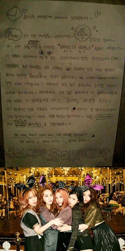 포미닛은 17일 오전 타이틀곡 ‘오늘 뭐해’를 비롯한 5집 미니앨범 ‘포미닛 월드’를 각종 음원사이트에 공개하며 컴백했다. 이날 소속사인 큐브엔터테인먼트는 공식 SNS 계정을 통해 포미닛 멤버들이 소속사 임직원들에게 직접 쓰고 그려 만든 손편지를 공개했다.