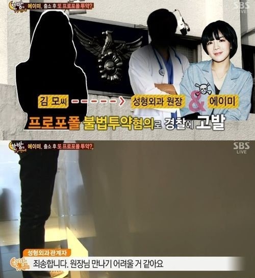 19일 방송된 SBS 연예정보프로그램 ‘한밤의 TV연예’에서는 에이미가 출소 후 프로포폴을 투약했다는 간호사 김모 씨의 주장에 따라 김 씨를 인터뷰했다. 이날 방송에서 김 씨는 “증거를 확보한 상태에서 고소했다”며 “사실확인서와 녹음 내용 등이 있다”고 말했다. 김 씨는 현재 해당 성형외과 원장 최모 씨를 성추행 혐의로 고소한 상태로, 김 씨는 최 씨의 성형외과에서 일해 왔다.