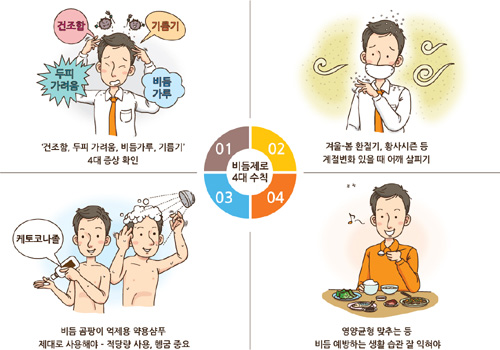 머리는 하루에 한번, 낮 동안 축적된 오염물질을 씻어낼 수 있도록 저녁에 감는 것이 좋다. 약간 따뜻한 물로 모발을 충분히 적신 다음 손바닥에 샴푸의 거품을 충분히 만들어 손톱이 아닌 손가락으로 두피를 부드럽게 마사지해야 각질제거와 두피 혈액순환에 좋다. 두피가 가렵다고 손톱으로 긁으며 샴푸하는 경우가 있는데 이는 자신도 모르게 두피 염증을 악화 시킬 수 있고 모발을 끊어지게 할 수 있으므로 피해야 한다. 머리를 말릴 때는 가급적 자연바람이나 찬 바람으로 말리고, 스타일링 제품 사용은 자제하는 것이 좋다. 비듬은 지나친 스트레스나 다이어트에 의해서도 나타날 수 있으므로 평소 스트레스 조절과 환절기 영양 관리에도 힘써야 한다.