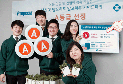 [쿠키 건강] 한국MSD의 탈모 치료제 프로페시아팀이 7일 공덕동 본사에서 프로페시아(성분명 피나스테리드 1mg)가 인종과 성별을 포괄하는 남성형 탈모치료 가이드라인에서 가장 강력하게 권장 받는 A등급 치료제로 선정1됨을 기념하는 사내행사를 가졌다.