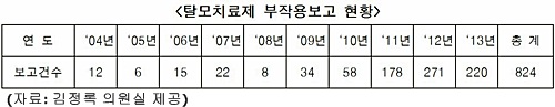 탈모치료제 시장 역시 2013년 590억원(생산·수입금액)으로 2004년 133억원대비 4배 이상 증가했는데 문제는 부작용도 급증한 것이다. 2013년 보고된 탈모치료제 부작용 건수는 220건으로 2004년 12건 대비 18배 늘어났다.