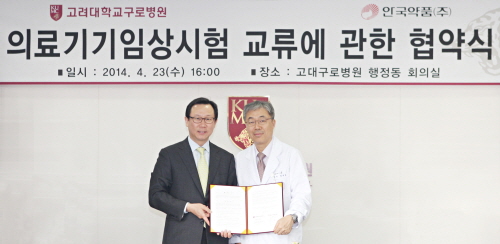 [쿠키 건강] 고려대 구로병원은 24일 행정동 3층 회의실에서 안국약품과 의료기기 개발 및 임상연구를 위한 업무협약을 체결했다.