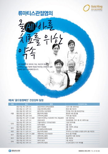 [쿠키 건강] 대한류마티스학회가 다음달 10일부터 한 달여간 전국 17개 대학/종합 병원에서 ‘제 5회 골드링 캠페인’의 일환으로 건강강좌를 개최한다.